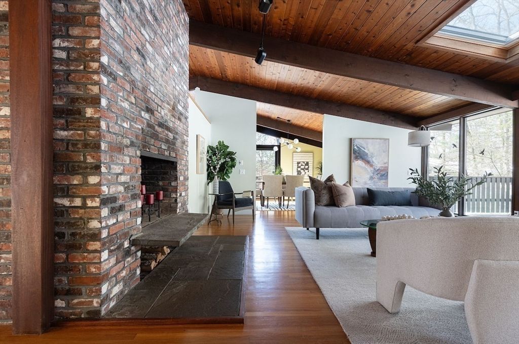Living Room: Skylight, Cathedral Ceiling(s), Flooring - Hardwood, Deck - Exterior, Open Floorplan, Slider