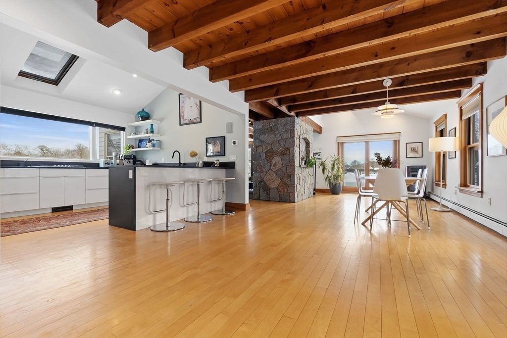 Kitchen: Skylight, Beamed Ceilings, Flooring - Hardwood, Countertops - Paper Based, Kitchen Island, Open Floorplan